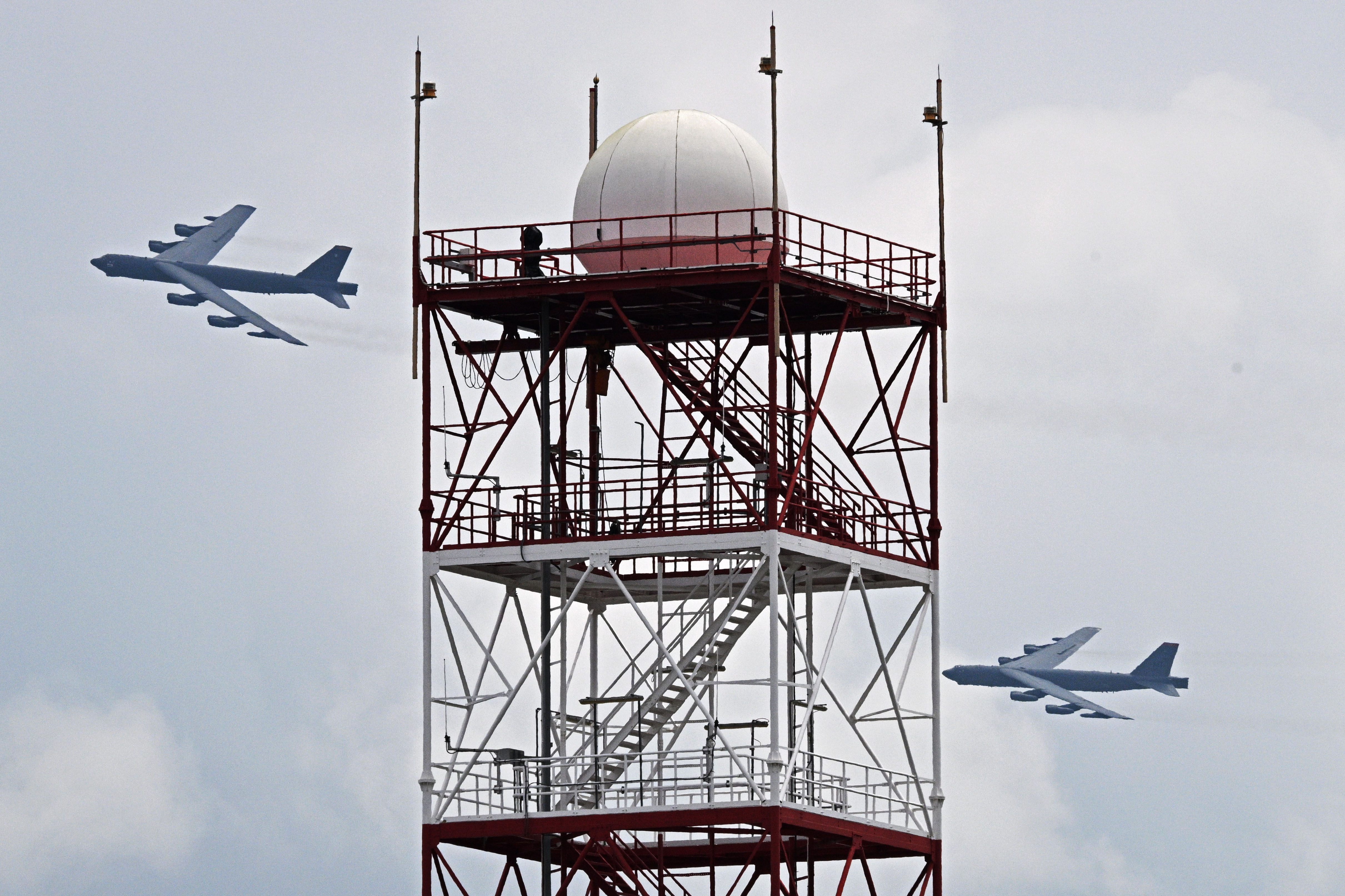 2月22日,两架美国空军B-52轰炸机在新加坡航展上做飞行表演。新华社发(邓智炜摄)