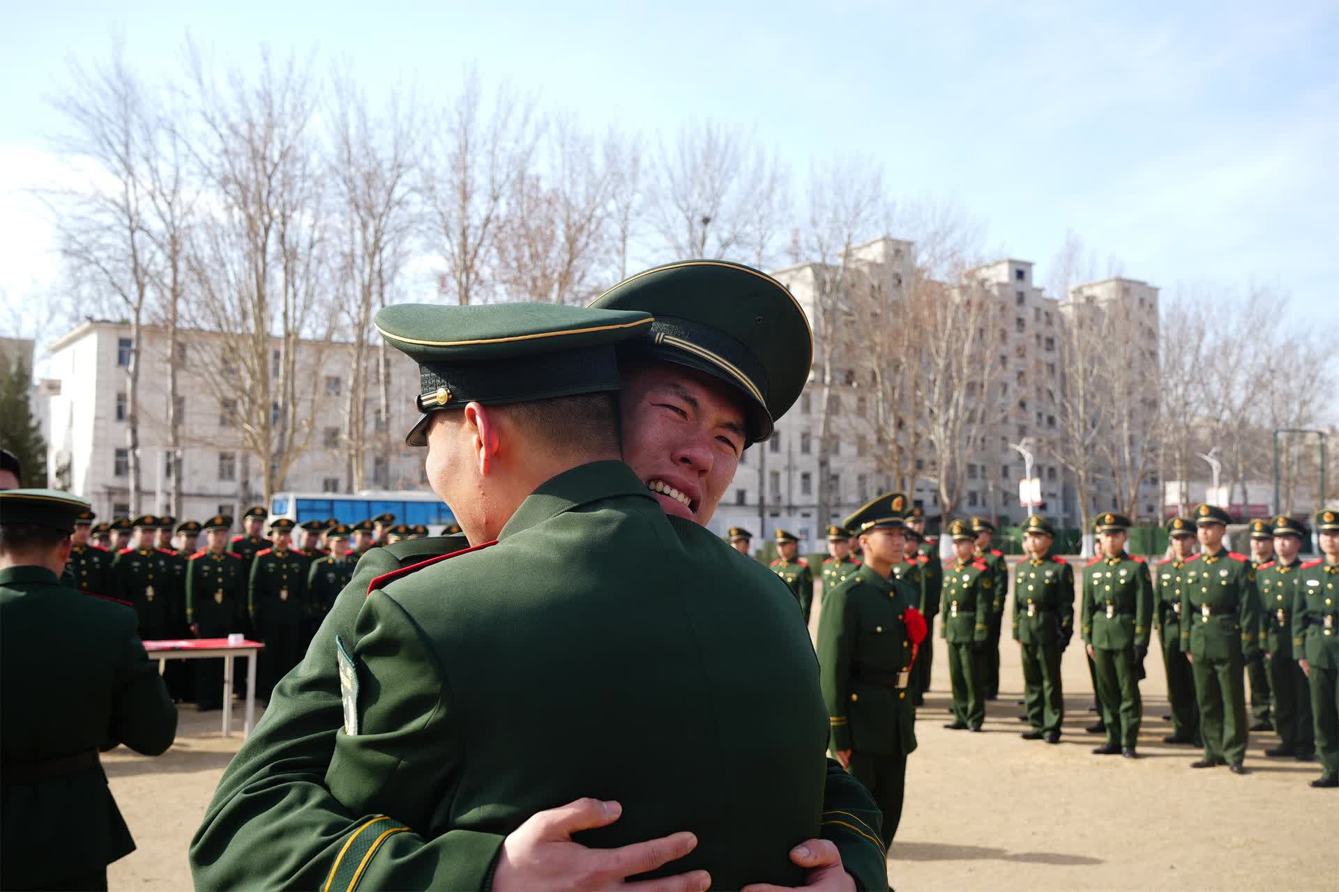仪式结束后,在催人泪下的乐曲中,退役老兵强忍住泪水互相拥抱,依依惜别。
