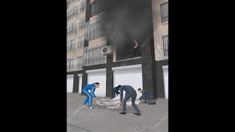 如果地面有人围观,围观人员应就近找来较高的梯子,液压剪,多人用被褥打开接人等方法,对逃生人员进行营救,最大程度减少人员伤亡。