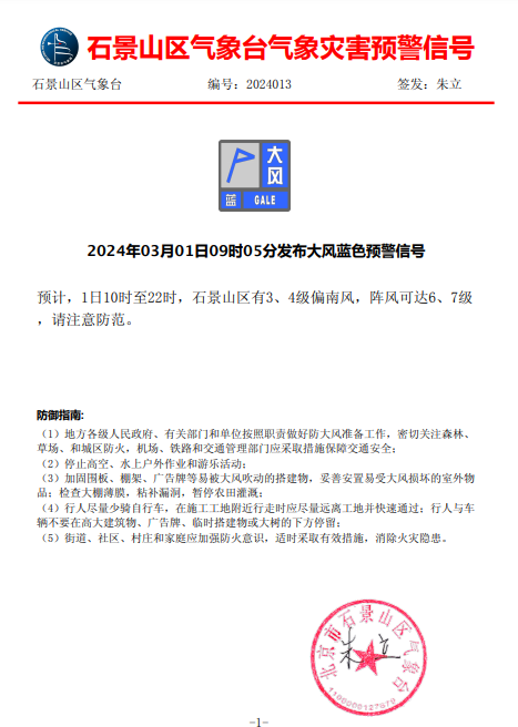 石景山区气象灾害预警中心2024年03月01日09时05分发布大风蓝色预警信号:预计,1日10时至22时,石景山区有3、4级偏南风,阵风可达6、7级。大风时建议停止高空、水上户外作业和游乐活动;加固围板、棚架、广告牌,妥善安置室外物品并关好门窗;行人与车辆不要在高大建筑物、广告牌、临时搭建物或大树下方停留;火险等级较高,注意防范。