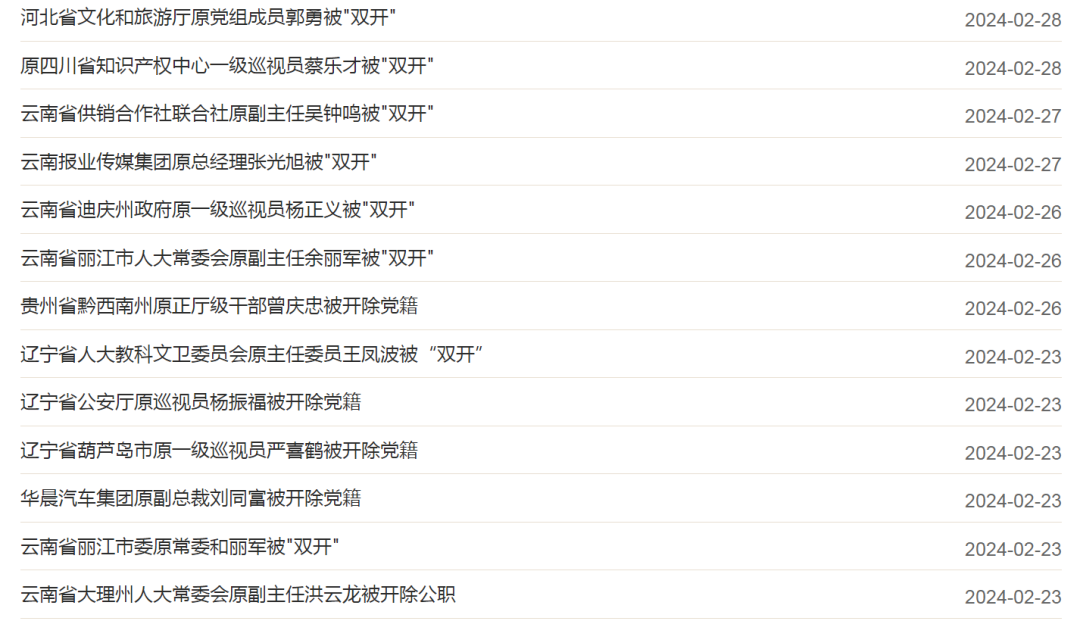 另外还包括:云南省丽江市人大常委会原党组成员、副主任余丽军被开除党籍和公职;辽宁省葫芦岛市原一级巡视员严喜鹤被开除党籍;华晨汽车集团控股有限公司原副总裁刘同富被开除党籍;等等。