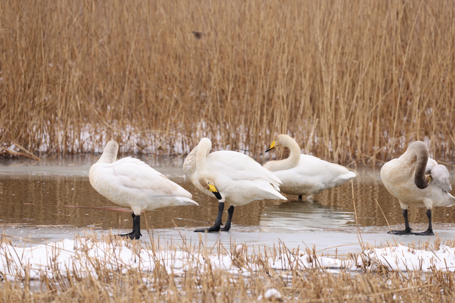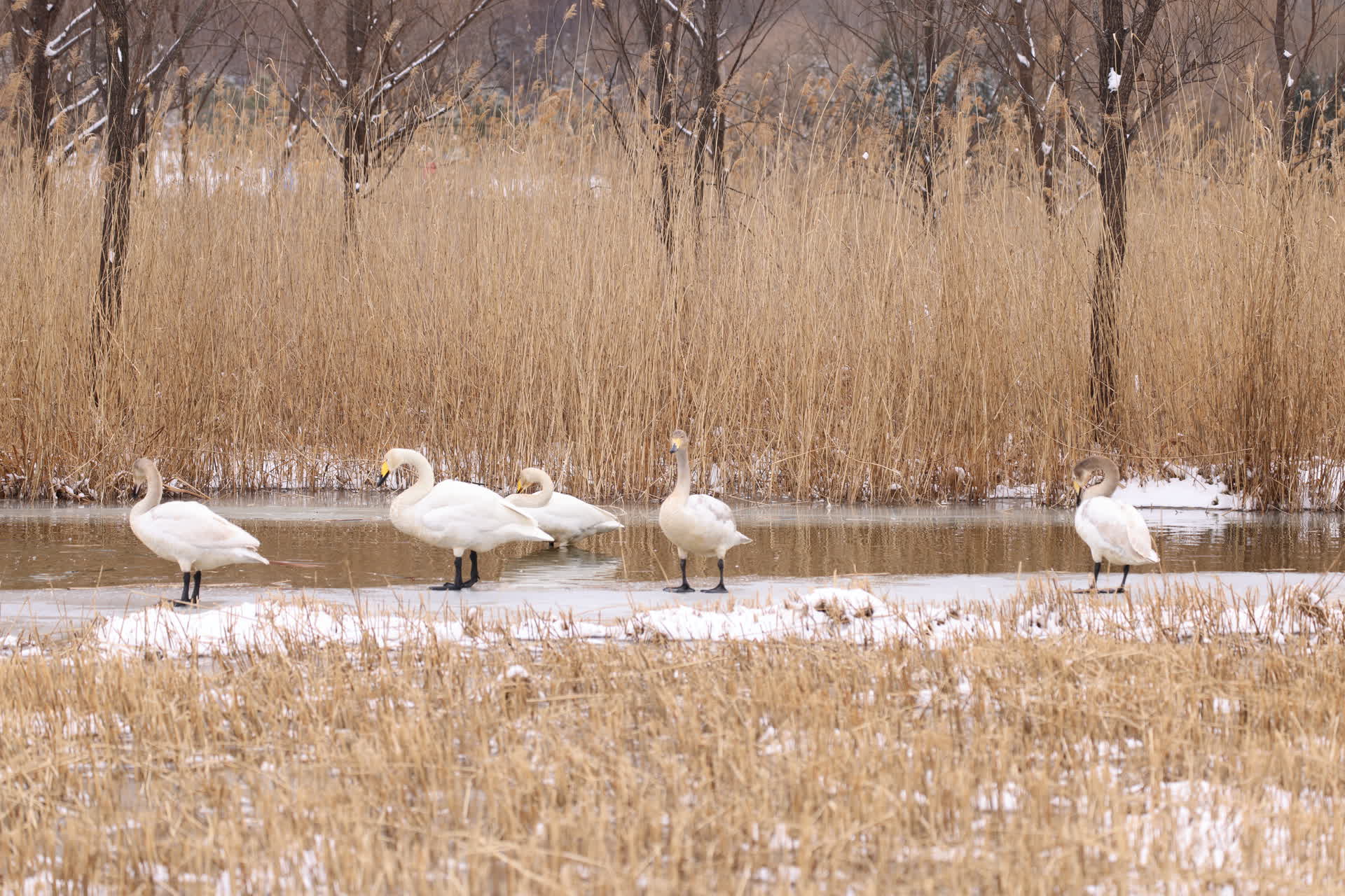 摄影爱好者半川人专程从丰台赶来,他在奥海东北侧的芦苇丛中,拍到了大天鹅。“大天鹅分成了两拨,一拨有两只,另一拨是两只大的带着三只体型小些的。正在休息的大天鹅不时伸伸懒腰、蹬蹬腿,优雅又慵懒。”半川人说。