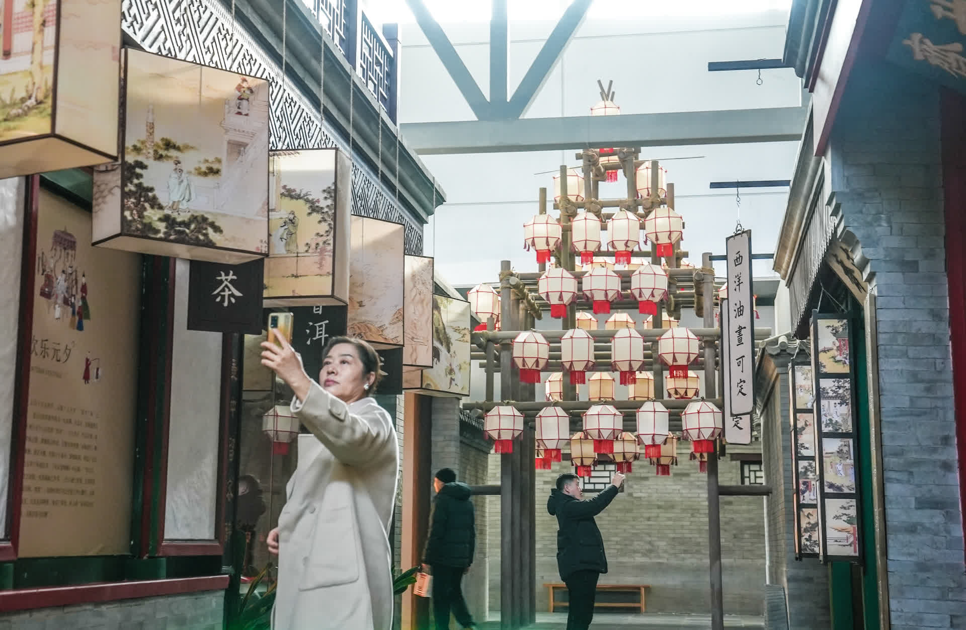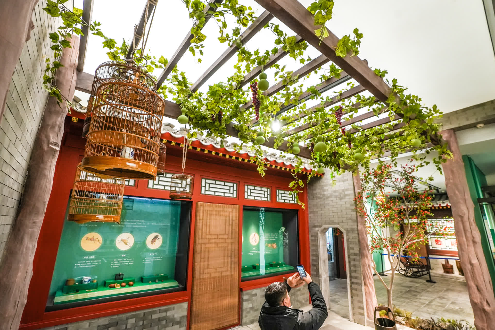 展厅中还设置了不少“彩蛋”,静待观众打卡。紧扣时序节令,白塔寺、什刹海、陶然亭……一个个老北京地标融入展厅场景之中,呈现京味民俗的符号特征,使得观众在参观的过程中,对京韵文化的亲切感油然而生。
