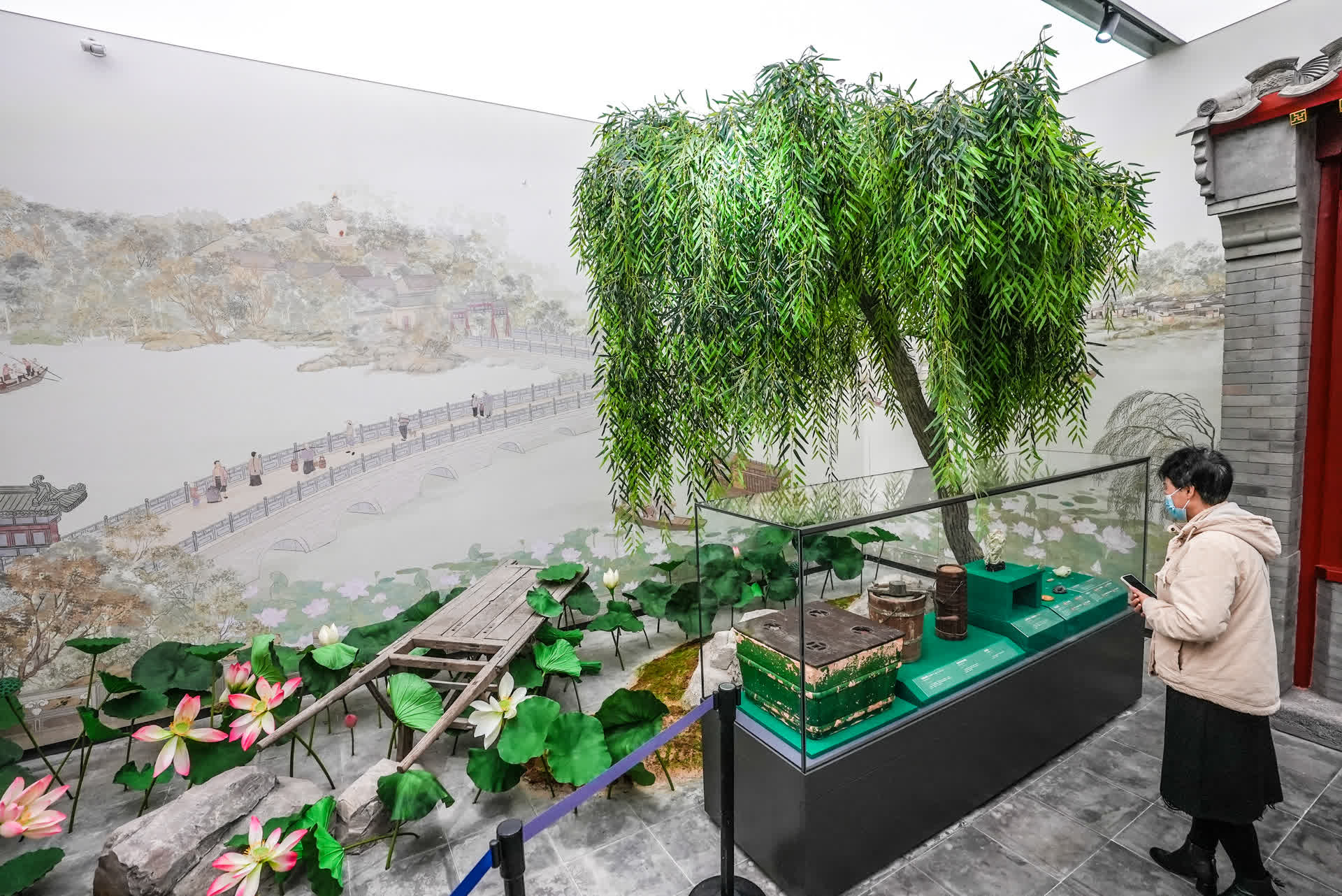 展厅里复原了一处“什刹海荷花市场”。每年从端阳节开始,荷花市场堤岸便搭起茶棚,汇集了众多商贩和曲艺杂耍艺人,成为别具一格的消夏场所。老北京人所称“二闸”,是通惠河上的第二道闸口“庆丰闸”,水面宽广,水草丰盛,树木葱茏,也是夏天消暑纳凉的好地方。为了反映老北京夏日胜景,展览中配合展出了莲荷鹭鸶白玉活链盖卣、青玉游船、累丝嵌宝石荷舟游人金饰件等文物。