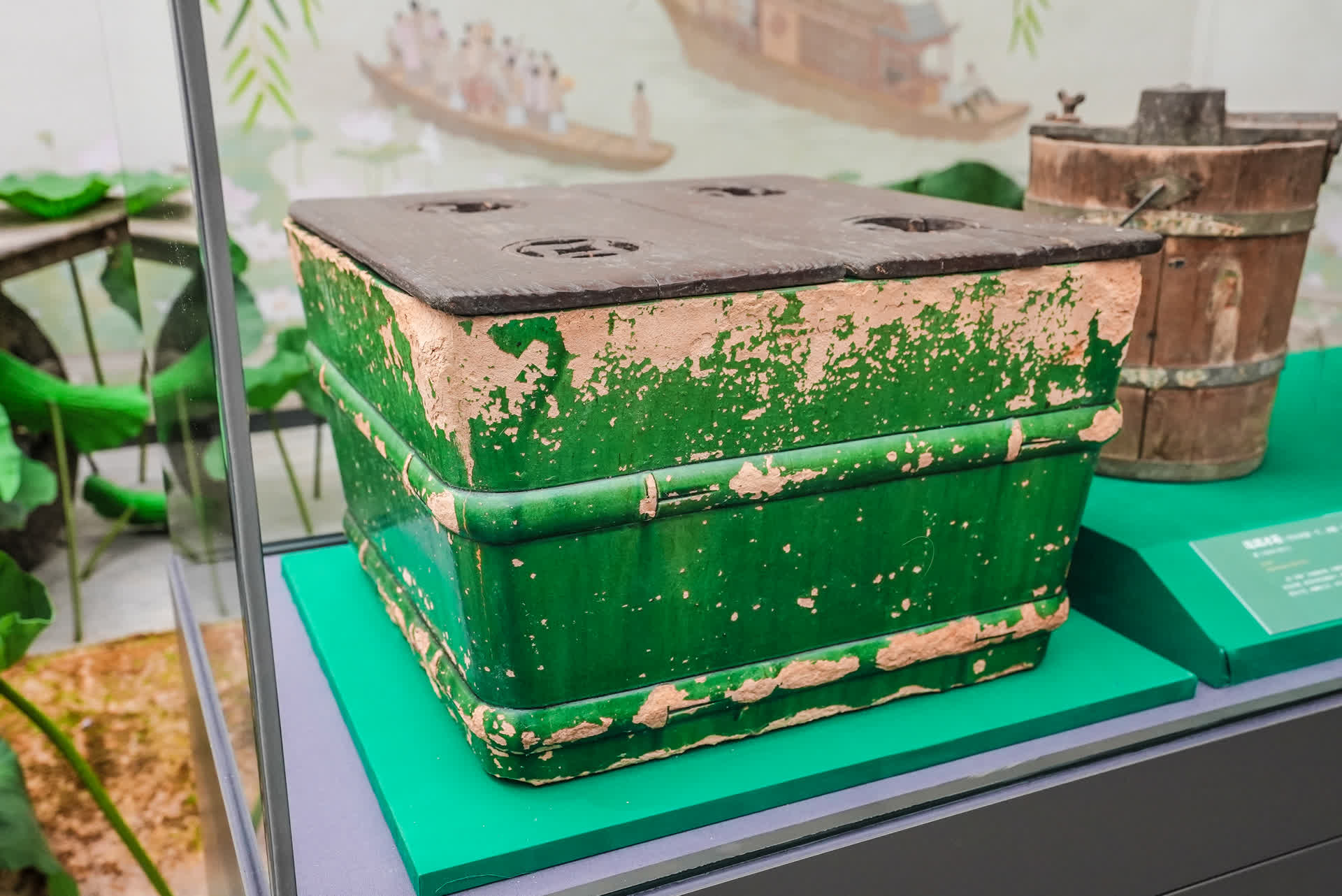 展柜里还有一组老物件,称得上老北京的解暑“神器”。一件清代大户人家的“土冰箱”,由琉璃制成,里面贴锡,可在下层放冰,上层放食物。箱底有小孔,冰融化之后,水从小孔排出。放进“冰箱”里的冰块每天都要更新,以免因融化降低效果。“冰箱”旁边,摆放着制作冰食、装冰食的工具——木桶式冰激凌机和冰棍桶。