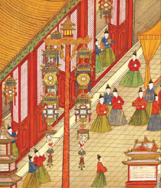 展厅里还搭起鳌山灯,重现《明宪宗元宵行乐图》中描绘的场景,呈现“人在画中游”的感觉。“鳌山”是以松柏枝搭架,挂满各式灯笼并装饰以八仙和乐工伶官人物形象的大型灯棚。元宵观“鳌山”是宫廷灯节的常例,皇帝一般会在午门上设宴招待高级官员,门前搭建“鳌山”供百姓前往观看,以示普天同庆、与民同乐。