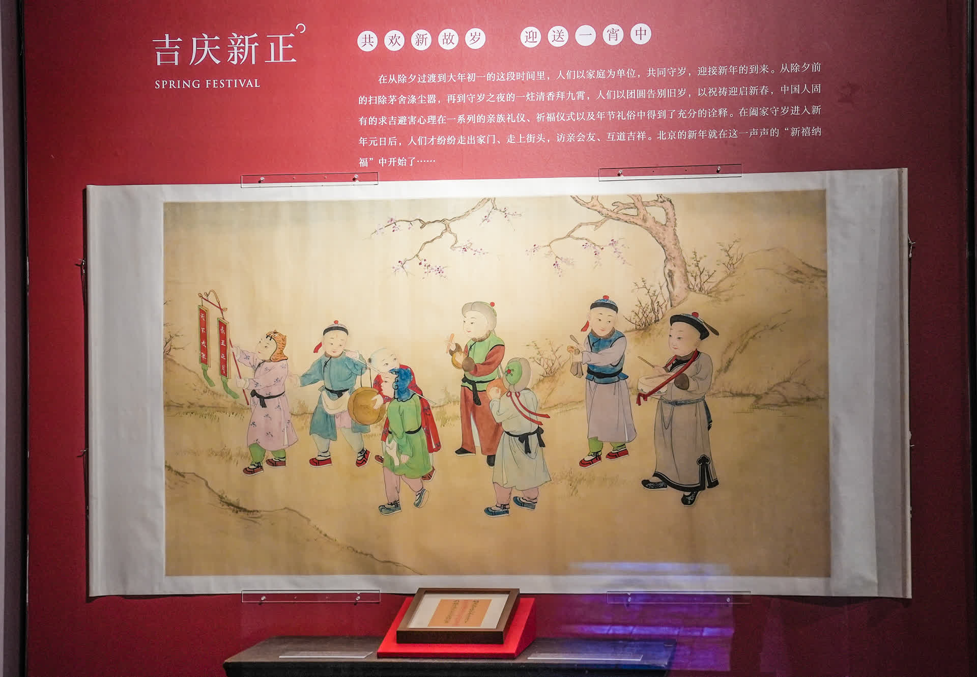 走进“料峭寒中喜迎春”展厅,红色是主打色,处处洋溢着新春的气息。展柜里,一幅《八子迎春图》和一件乾隆元年(1736年)皇帝的“元旦开笔”率先亮相,象征着阖家守岁、迎启新春。田辛酉解读,《八子迎春图》描绘了孩童喜气迎春的场景,画面以折枝梅花为背景,突出了冬春之交的时令特征,蕴含“梅传春信”之意。仔细看,画中为首的一位童子手执一副迎春对联,写有“春王正月 天下太平”八个字,寓意美好。
