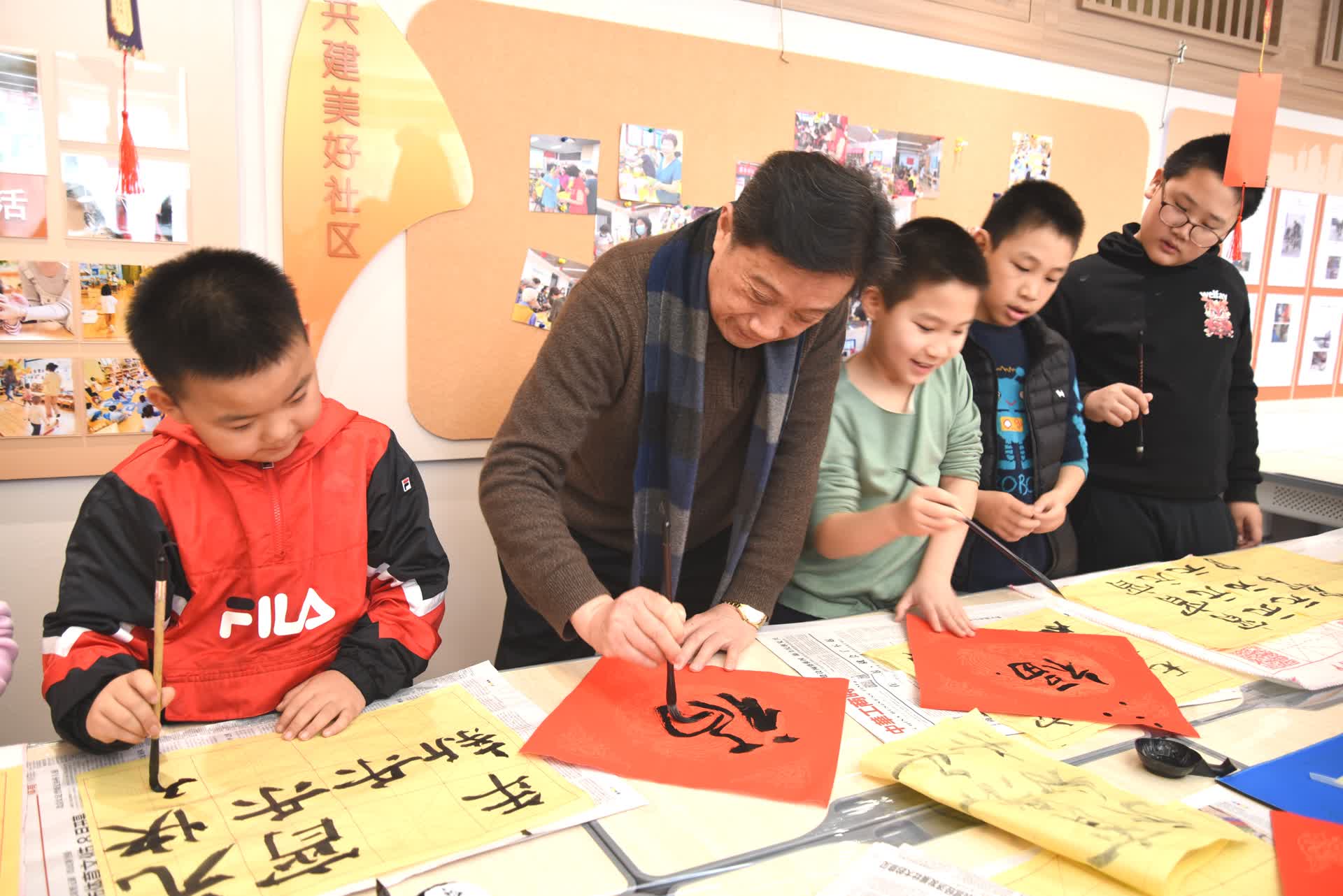 10岁的王艺霖第一次尝试写“福”字,心里有些忐忑。“好在有爷爷过来帮忙指导,爷爷会先示范一次,我写完再给我纠正。”尽管第一幅作品写得并不理想,但王艺霖还是得到了老人的鼓励,“一位奶奶也主动带着我写,后来越写越好,还带回家贴在了门上。”一个多小时的活动中,王艺霖被老人们的热情深深打动。