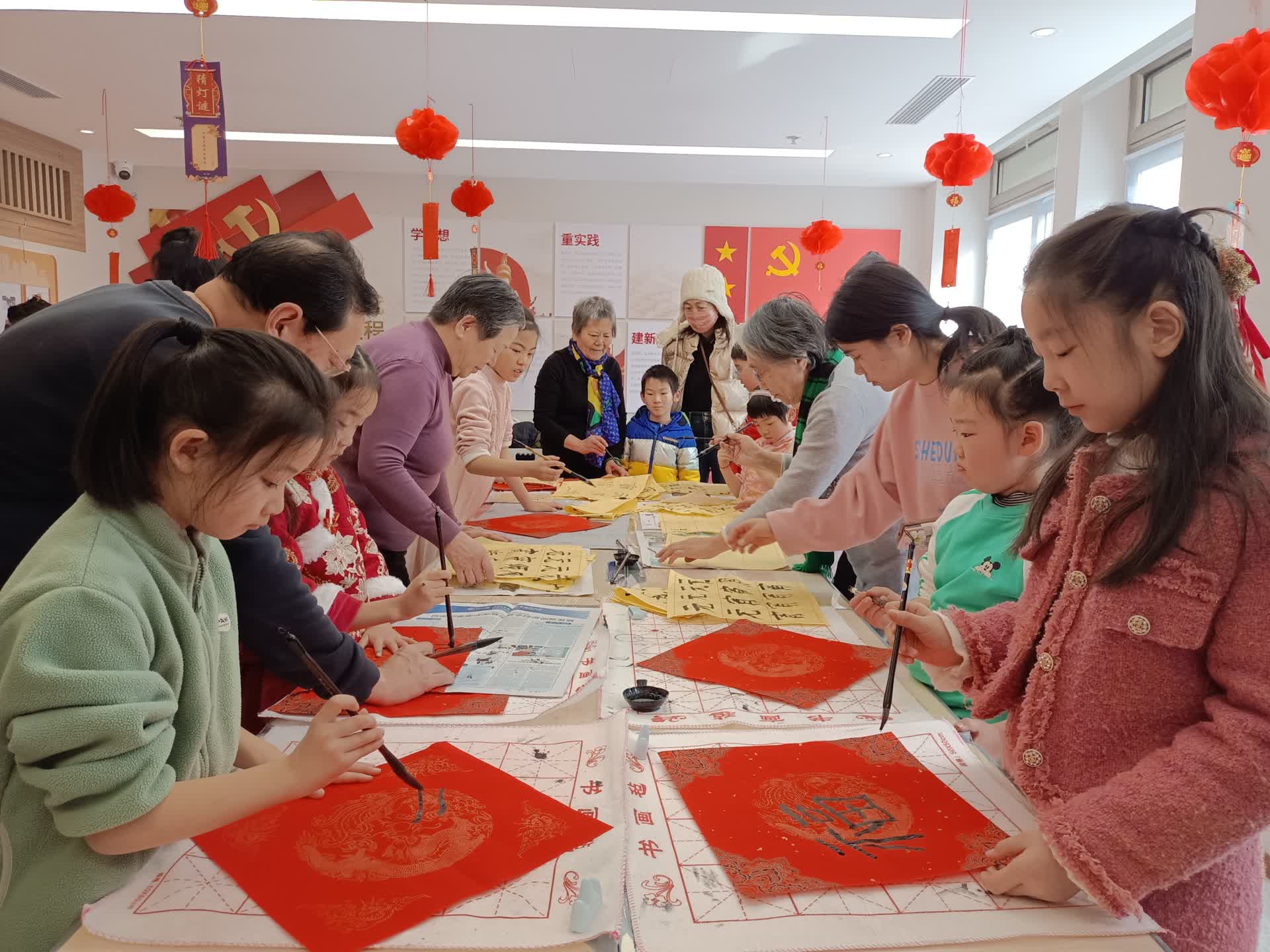 “一开始写‘元宵节快乐’时不太知道该怎么定位,有位爷爷建议我从中间的字开始写,这样更好参照。”9岁的靳雅婷曾经学过一年书法,多少有些基础,在老人们的肯定下,她写得格外投入,“爷爷奶奶都特别亲切,大家一起边商量边写字,那种其乐融融的感觉真好。”