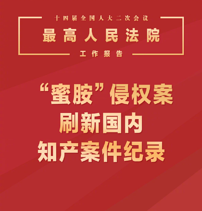 最高法工作报告:依法严格保护知识产权。审结知识产权案件49万件,同比增长1.8%。适用惩罚性赔偿319件,同比增长117%,判赔金额11.6亿元,同比增长3.5倍。审理“蜜胺”发明专利及技术秘密侵权案,在判令侵权方赔偿2.18亿元基础上,执行中促成全面和解,侵权方获得使用许可,权利人最终获偿6.58亿元,刷新国内知识产权案件纪录。