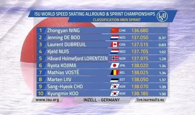 北京时间3月9日凌晨,本赛季速度滑冰国际赛事收官战——全能世锦赛在德国因采尔结束了短距离全能项目的争夺。中国名将宁忠岩延续良好状态,在500米中两次刷新个人最好成绩,1000米则两夺第一名,最终获得总成绩冠军。这也是中国男选手首次登上短距离全能世锦赛的领奖台。