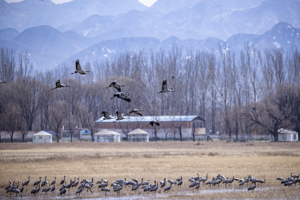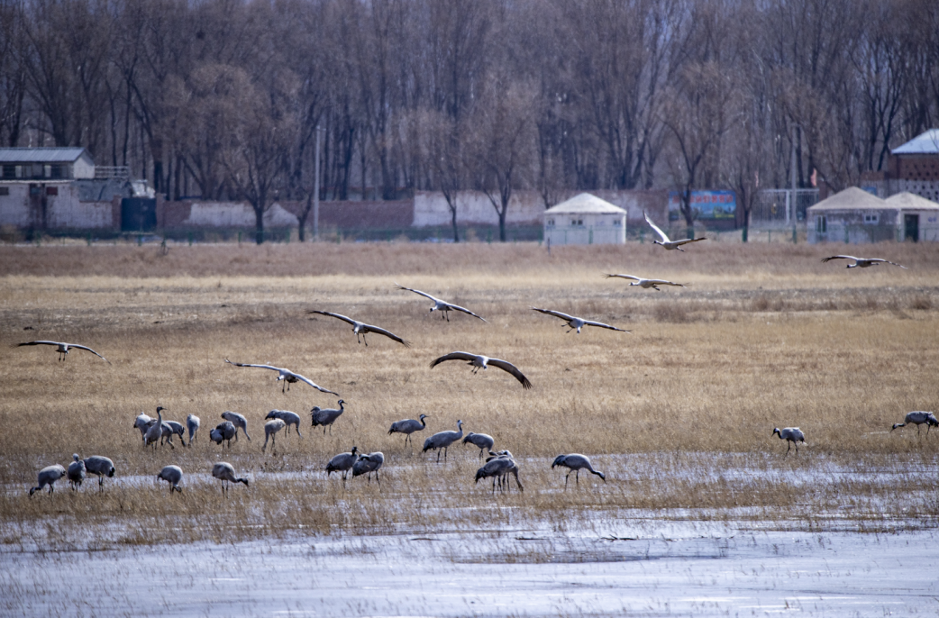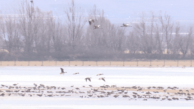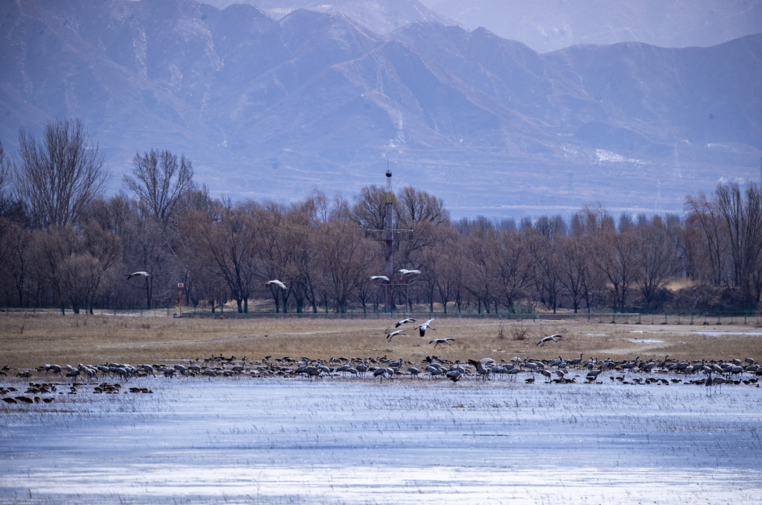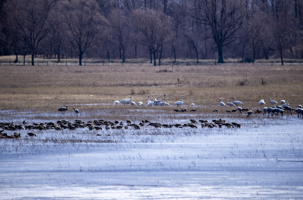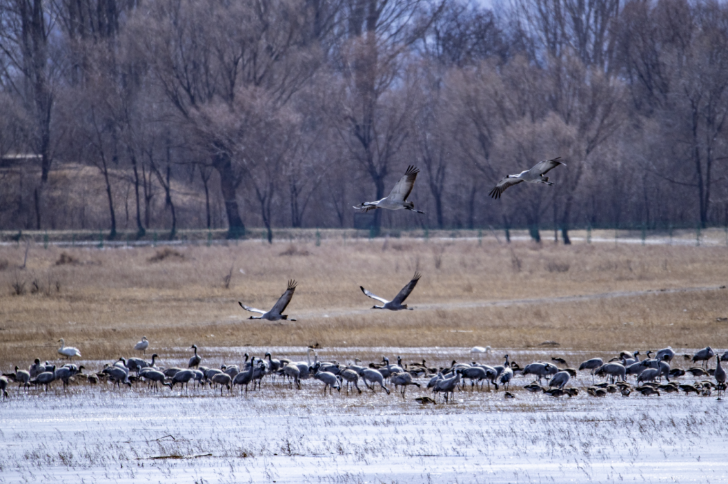 3月7日,在位于延庆的北京野鸭湖湿地自然保护区,共发现4000余只灰鹤回迁至此,随同前来的还有大批的豆雁、绿头鸭、赤麻鸭等在湖面觅食。