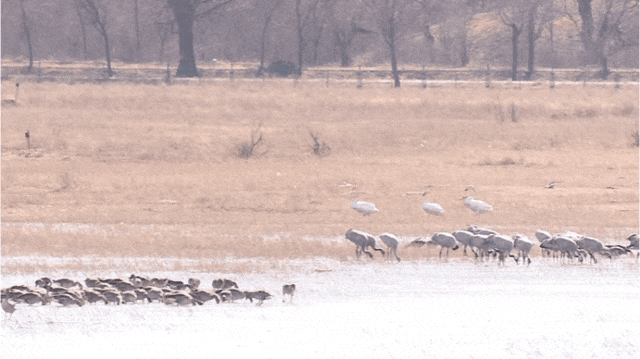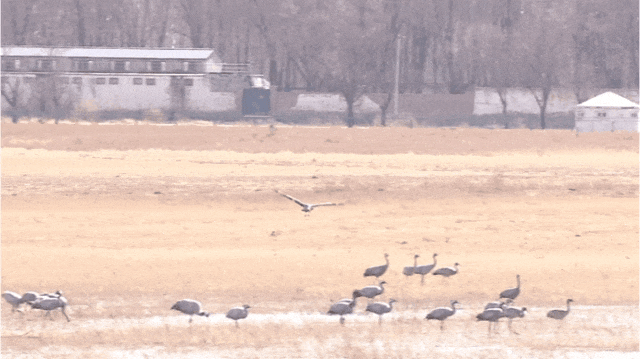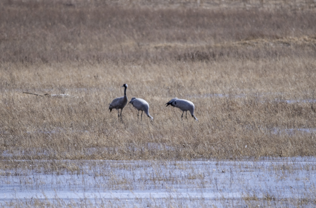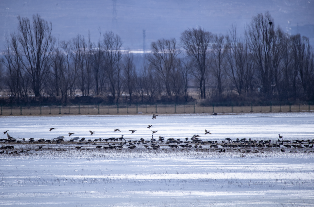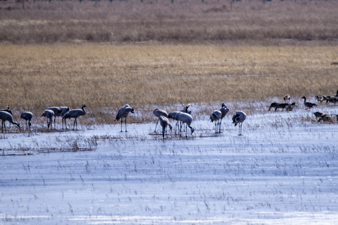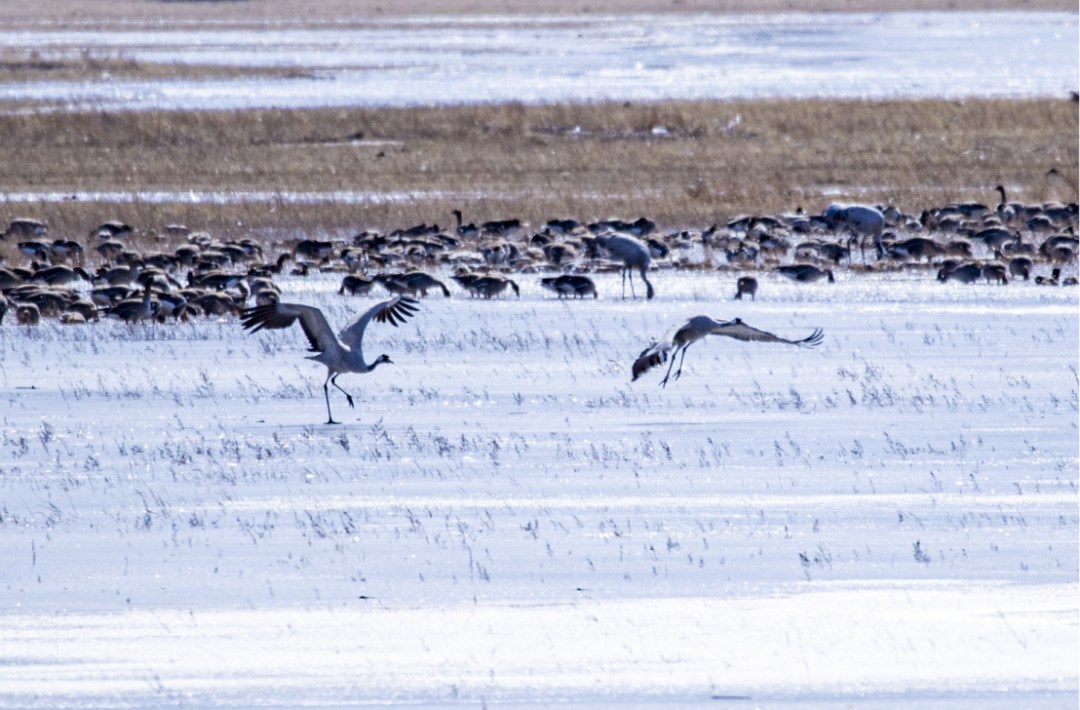 3月7日,在位于延庆的北京野鸭湖湿地自然保护区,共发现4000余只灰鹤回迁至此,随同前来的还有大批的豆雁、绿头鸭、赤麻鸭等在湖面觅食。