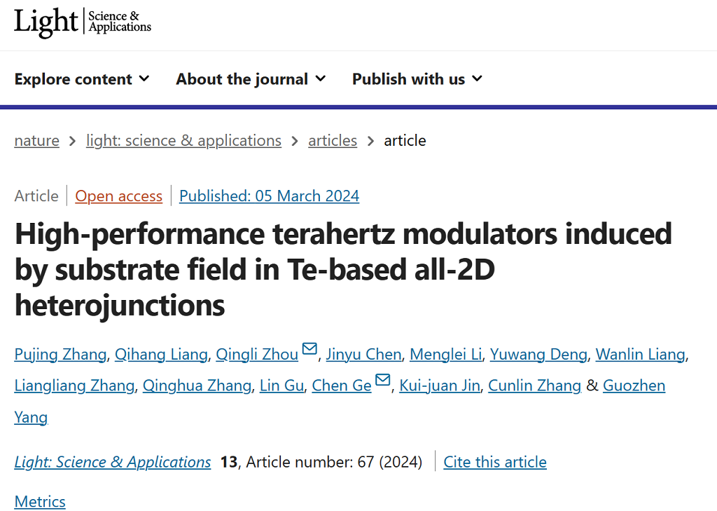 3月5日,以首都师范大学为第一单位、首都师大物理系周庆莉教授为通讯作者,题为《碲基全二维异质结衬底场诱导的高性能太赫兹调制器》(High-Performance Terahertz Modulators Induced by Substrate Field in Te-Based All-2D Heterojunctions)的重要研究成果发表在《光:科学与应用》(Light: Science & Applications)。中国科学院物理研究所葛琛研究员作为共同通讯作者,物理系博士生张朴婧为第一作者,共同作者包括中国科学院物理研究所杨国桢院士、金奎娟院士、张庆华副研究员、清华大学谷林教授、物理系张亮亮和张存林教授、李梦蕾副教授等。