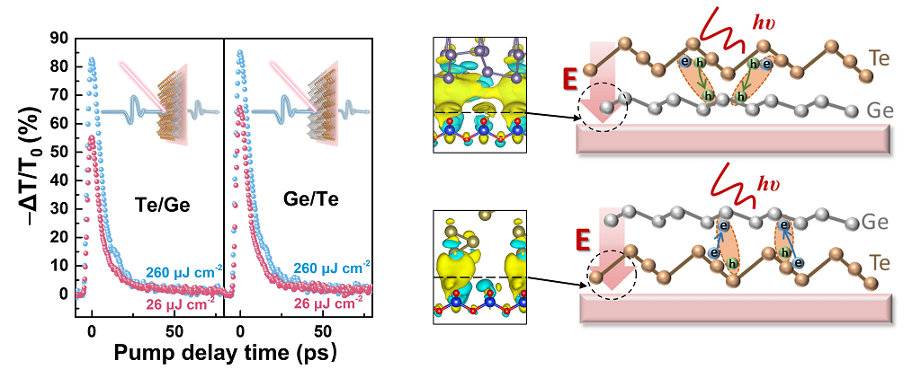 高性能太赫兹调制器是未来6G通信系统关键技术,但长久以来存在调制深度和速度不兼容的问题。二维材料组成的异质结因其可忽略界面失配的优异特性,以及在界面处的光生载流子动力学输运特性,可为全光太赫兹调制器的性能提升与优化另辟蹊径。碲纳米薄膜具有独特的螺旋结构,表现出带隙可调、高载流子迁移率、高光电导率和高导热系数等优良特性,通过对其异质结的研究发现材料的堆垛顺序极大地影响着器件的性能。特别是,堆垛顺序是锗/碲的异质结可实现超高调制深度以及皮秒量级的载流子寿命,这是目前宽带全二维异质结中的最优指标,进一步结合跨波段的光响应测试印证了异质结的堆垛顺序能调控器件性能,并通过第一性原理计算首次明确了衬底诱导有效电场的方向以及其在光激发电荷动力学中不同寻常的作用机制。该研究工作对全二维异质结中衬底场诱导的非平衡态载流子动力学的内部机制给出了更全面的理解,为高性能太赫兹调制器奠定了研究基础并提供了有效可行的设计指导策略,推动了纳米材料在太赫兹光电器件领域的应用。