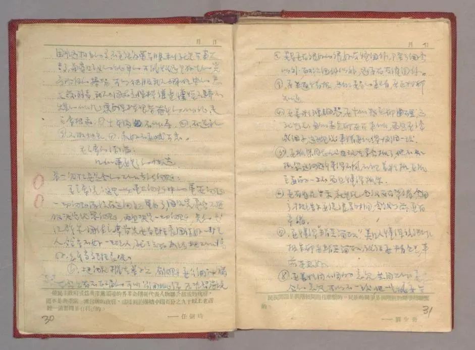 此外,笔记中还记录了毛泽东同志在党的七届二中全会上系统阐述的党委会的工作方法部分内容:“毛主席的结论:几个重要(问)题的传达。①把问题摆在桌子上,有问题要公开讨论,若会上有不正确的可以公开批评,不准背后说;②委员要有很好的友谊关系,除了开会以外,政治团体以外,还要有友谊关系;③要互通情报,各个委员的事情,要互相都知道;④要善于弹钢琴,要十个指头都硬,这就是说:每个委员都要有事做,而且要弹成调子,这就是说事情要做得协调一致。”