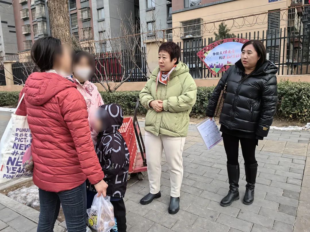 田荣华(右一)和张志金叮嘱家长不要把孩子一个人留在家里。