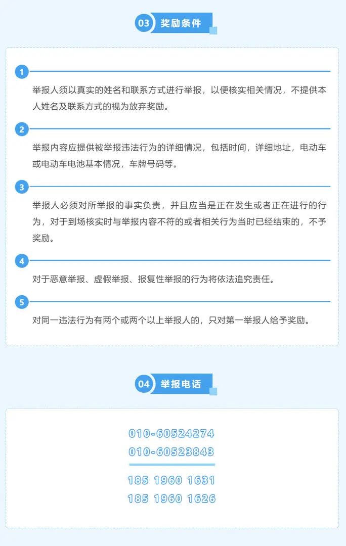 近日,北京西城已有多人获得现金奖励。另外通州梨园也发布了举报电动自行车安全隐患的细则,明确了举报时限、举报途径、核实办法、处理办法和奖励办法。经核实情况属实的,给予举报人人民币200元的奖励。