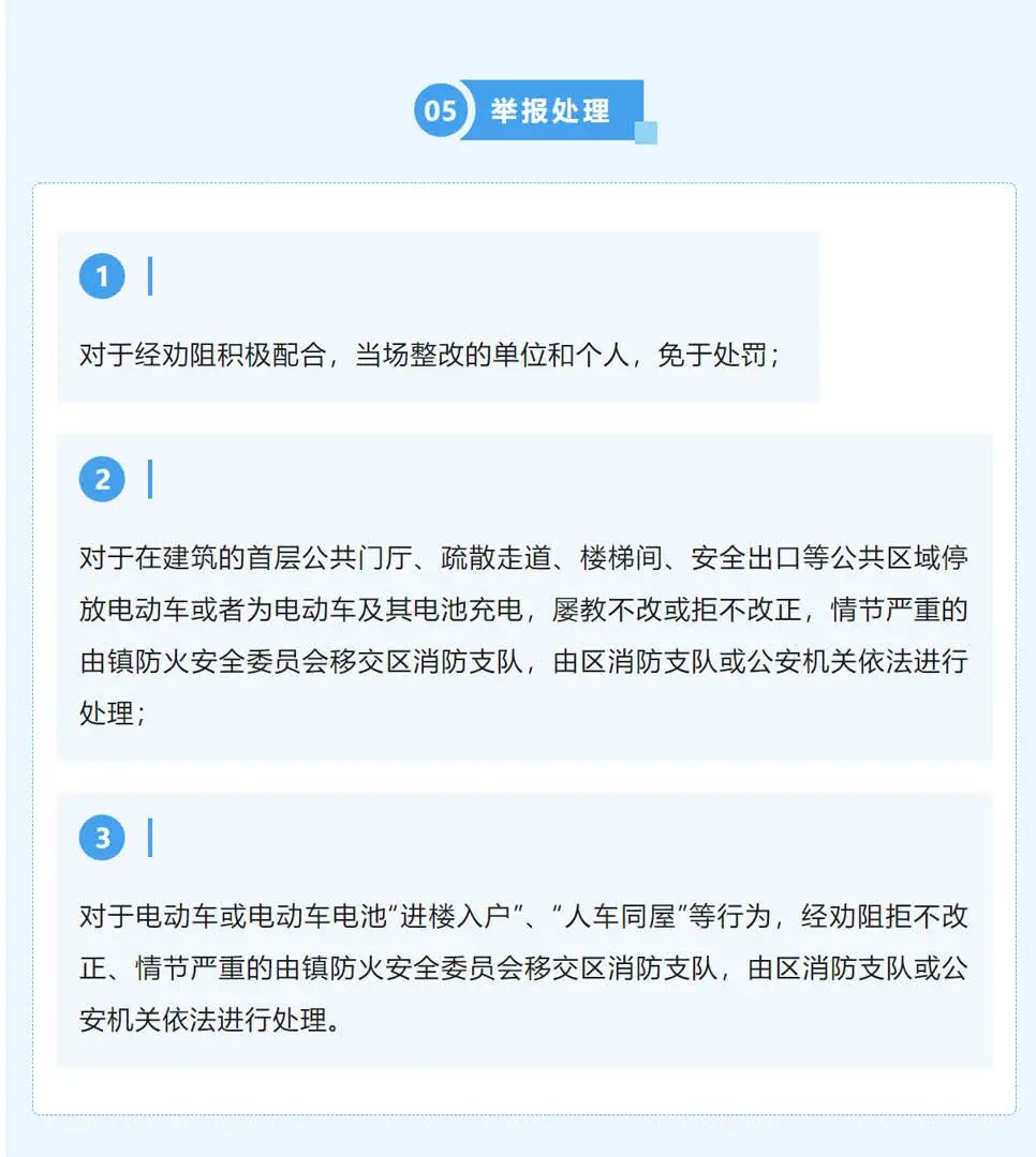 三是,对于电动自行车或电动自行车电池“进楼入户”“人车同屋”等行为,经劝阻拒不改正、情节严重的由镇防火安全委员会移交区消防救援支队,由区消防救援支队或公安机关依法进行处理。