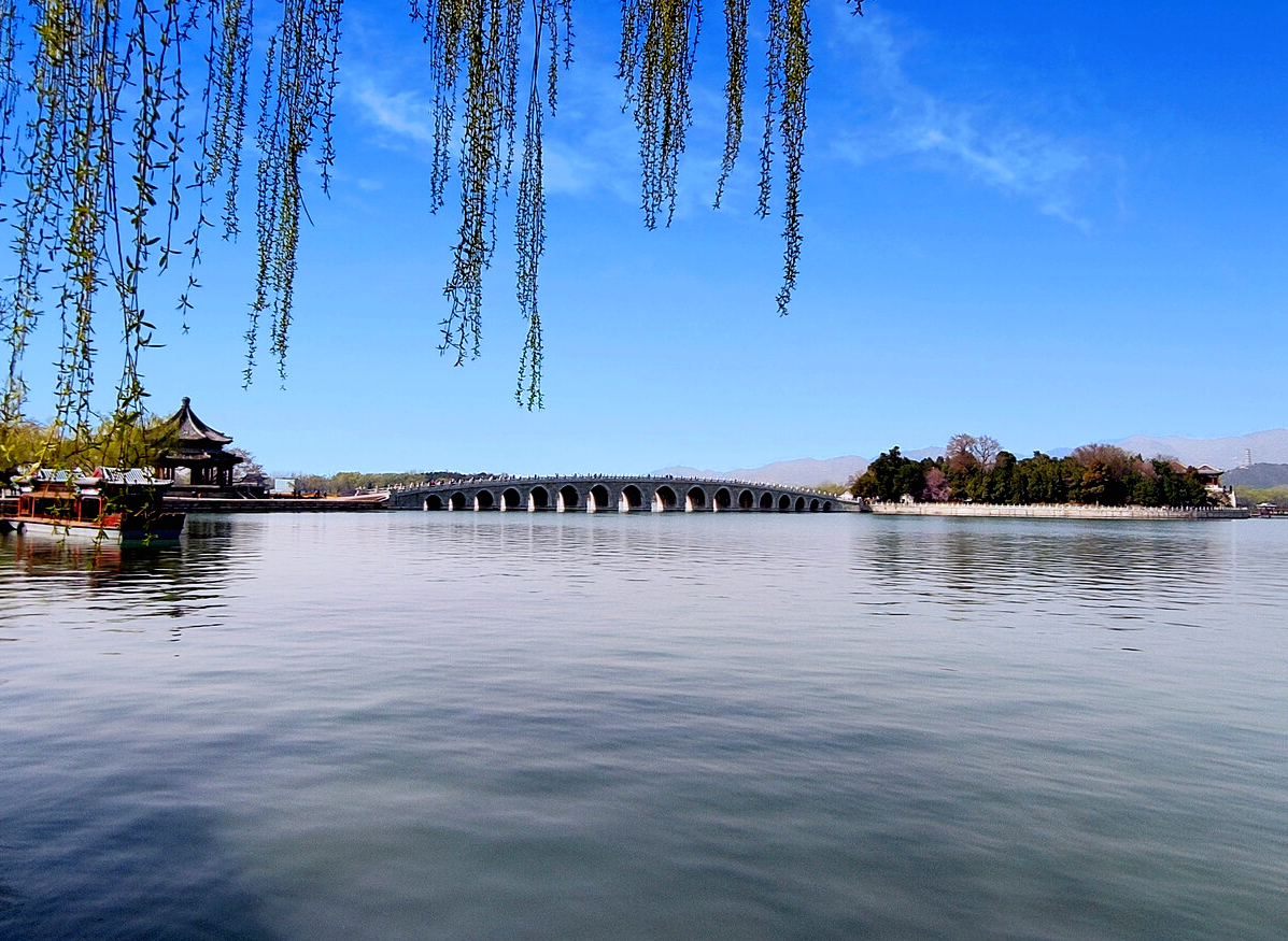 春花竞放,西堤山桃花盛开。忽然,微风扬起一阵阵“山桃花雨”拂面而来。远山蒙蒙,湖光潋潋,塔影桥身,倒映水面。虽为人工,宛如天开。这水色一天,无双盛景,让中国最后一座皇家园林犹如天设地造。