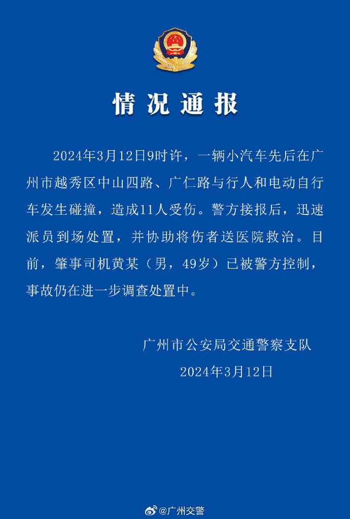 据@广州交警 消息,2024年3月12日9时许,一辆小汽车先后在广州市越秀区中山四路、广仁路与行人和电动自行车发生碰撞,造成11人受伤。警方接报后,迅速派员到场处置,并协助将伤者送医院救治。目前,肇事司机黄某(男,49岁)已被警方控制,事故仍在进一步调查处置中。