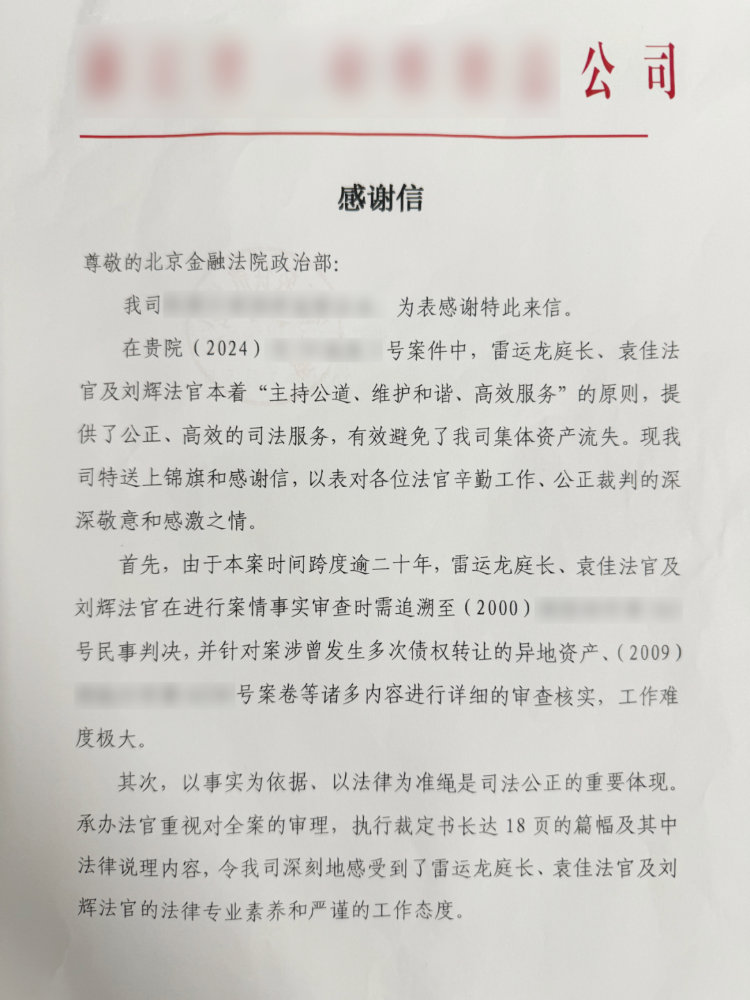 “二十多年的纠纷公正解决了,公司集体资产合法维护了,感谢法院!”北京金融法院诉服中心当事人接待大厅,某供销公司代表激动地将一面锦旗连同感谢信双手递给执行局局长雷运龙法官和袁佳法官。