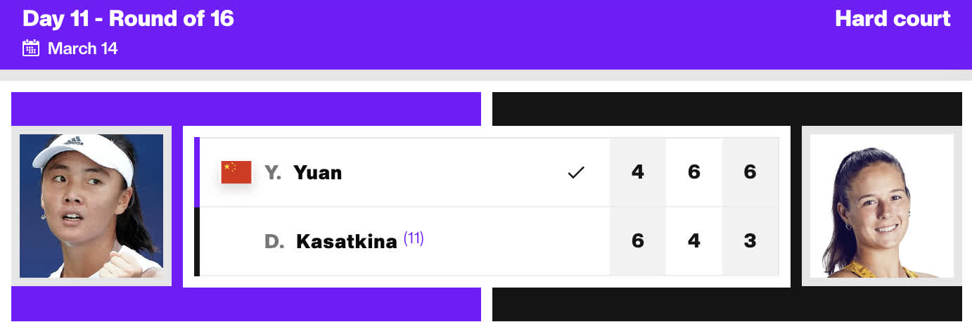 北京时间3月14日,在2024年WTA(国际女子网球协会)1000级赛美国印第安维尔斯站女单第四轮比赛中,中国网协球员袁悦继上轮2比1战胜对手之后,再演逆转好戏。她在先丢一盘的情况下,以2比1(4比6、6比4、6比3)击败赛会11号种子卡萨金娜,首次闯入WTA1000级别赛事单打八强。
