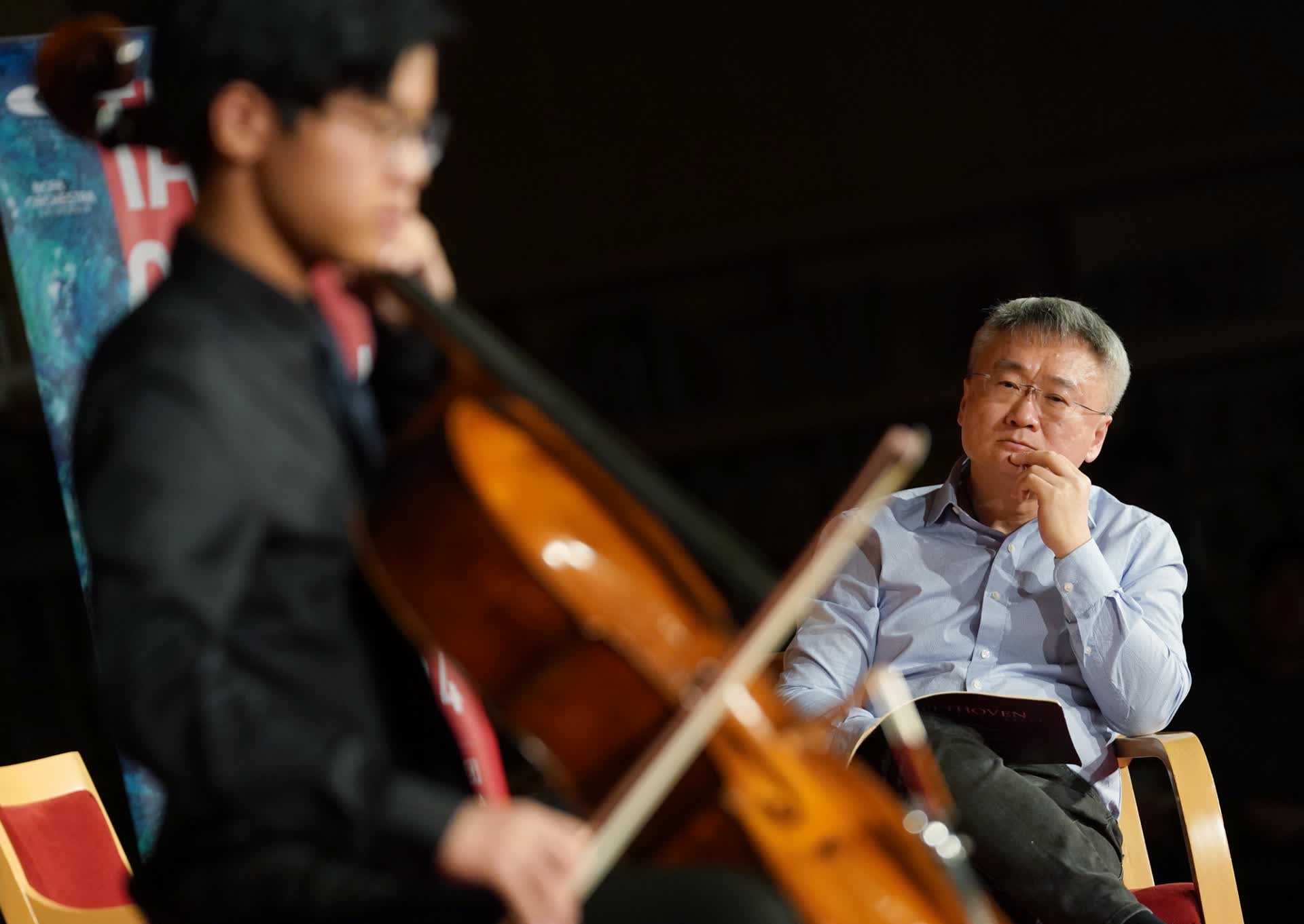 王健首先让夏商周把速度提起来,“像冬天早上四点起来,看到窗外的冰霜一样兴奋”,而不能像“秋天回家舒服地泡了一个热水澡”。他非常善用具体的形容来描绘音乐应该抵达的境界,比如,他以中国书法的行书喻指拉琴时连绵不绝的“气韵”,又以“挤毛巾”的手法、水墨画的浓疏类比琴声的“密度”。在指点王亚森时,王健让他在演奏中加上一点“脆弱和恐惧”,又像从沉睡中刚刚醒来。在一遍遍的“再来”里,大提琴与钢琴的配合明显变得越发顺畅,肖斯塔科维奇的精神世界悄然降临,打开了窥探其人生与心境的一角。