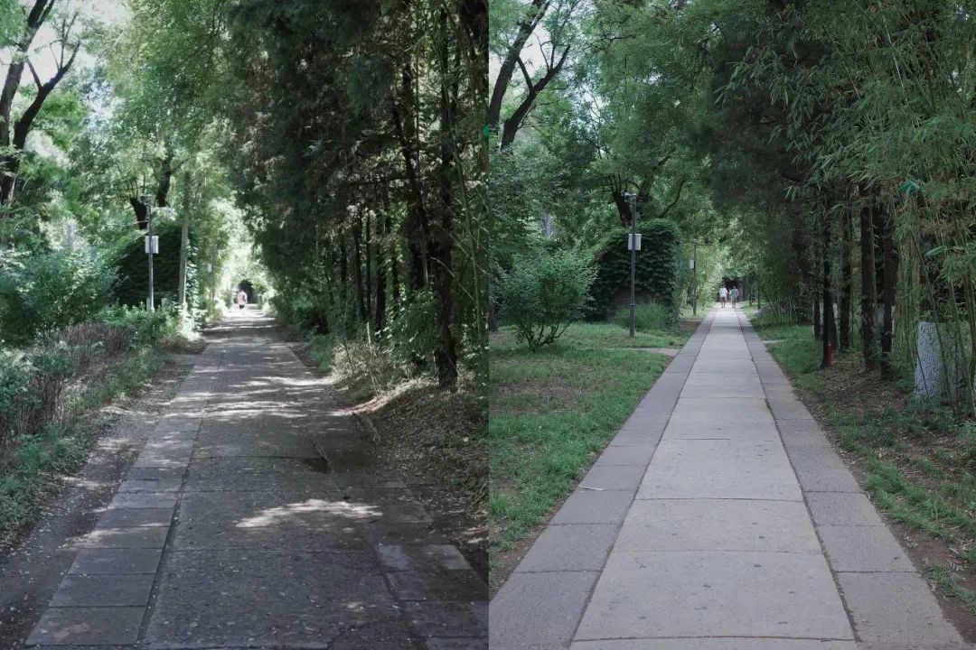 拼版照片,燕南园洋灰路整治前(左)与整治后(右)。受访者供图
