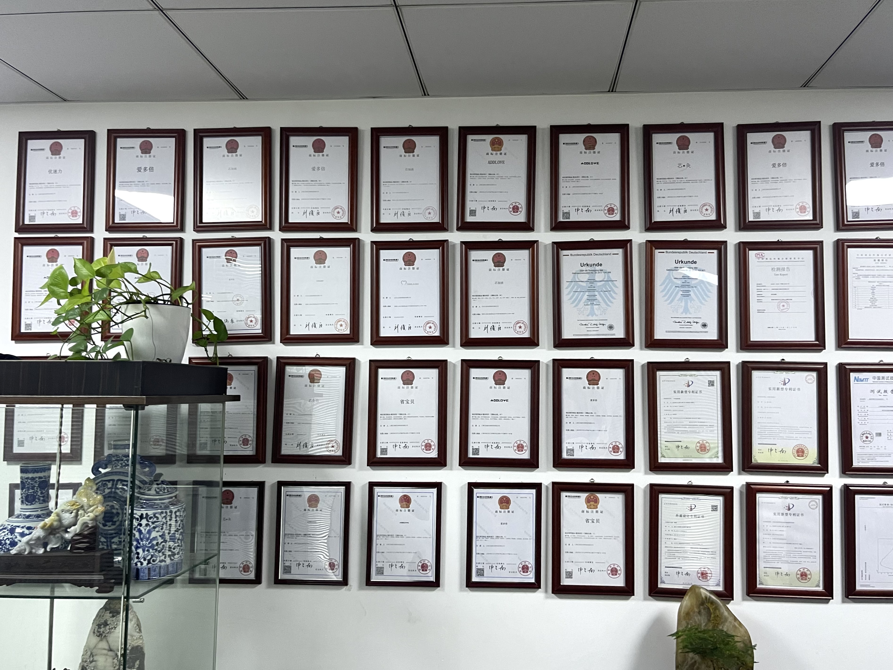 芯加波公司墙上挂着芯灸产品商标注册证、实用新型专利证书等。