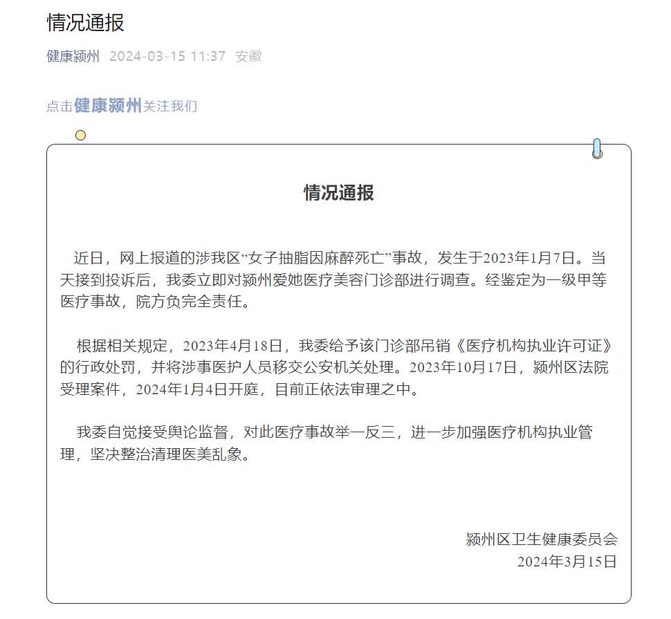 近日,网上报道的涉我区“女子抽脂因麻醉死亡”事故,发生于2023年1月7日。当天接到投诉后,我委立即对颍州爱她医疗美容门诊部进行调查。经鉴定为一级甲等医疗事故,院方负完全责任。