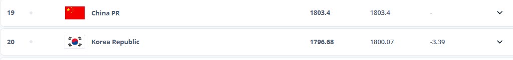 从上一期排名发布的2023年12月23日到本期排名发布的2024年3月15日,中国女足没有参加任何比赛,因此她们的排名积分没有变化。排名世界第19位的同时,中国女足在亚足联旗下女足球队中名列第4位,落后于日本女足(第7位)、朝鲜女足(第11位)和澳大利亚女足(第12位)。在中国女足身后,是排名世界第20位的韩国女足。