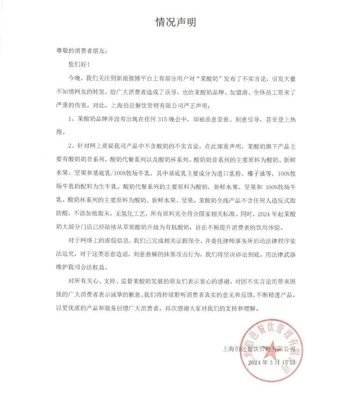 近日,上海市消费者权益保护委员会(以下简称“上消协”)点名茉酸奶品牌,对其芒果酸奶奶昔的高脂肪与高糖分提出质疑,这一事件也把公众对食品安全的关注推向高潮。对此,茉酸奶品牌方对饮品成分作出回应,称“所有原料完全符合国家相关标准”。