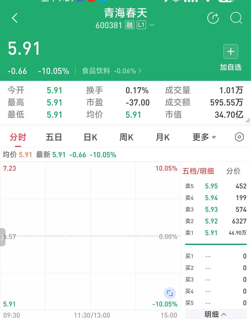 3月18日早盘,上交所上市公司青海春天药用资源科技股份有限公司(证券简称“青海春天”)股价以5.91元/股开盘,直奔跌停,公司最新市值为34.70亿元。