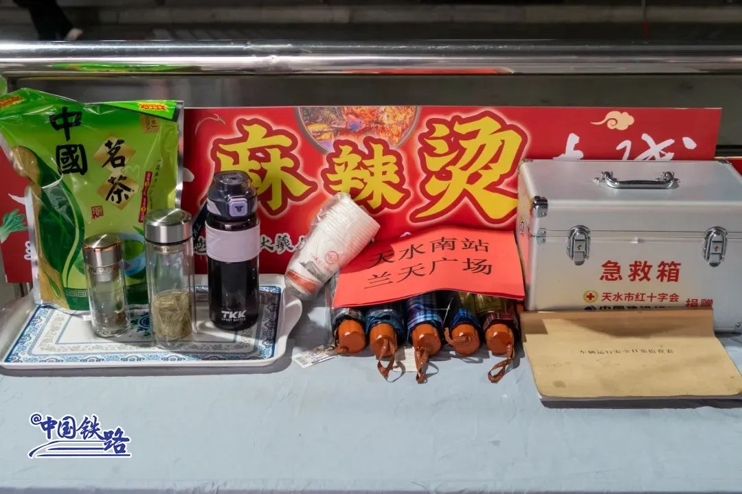天水南站站前广场设置了共享行李寄存柜,旅客可以便捷体验共享行李寄存服务,“轻装上阵”享受美味。“学雷锋志愿服务站”为旅客贴心准备了茶水,并配备雨伞、急救箱等物品,尽全力满足旅客需求。
