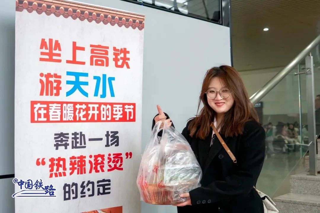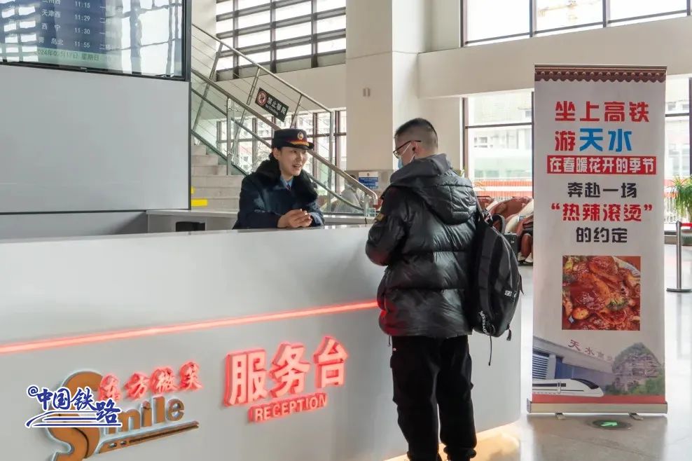 天水南站和天水站随处可见“坐上高铁游天水”的宣传展板。如果旅客有任何疑问,可以找到天水南站“东方微笑”服务台,领取一张车站自制的服务“小卡”,听工作人员介绍天水特色美食和旅游景点游玩攻略。