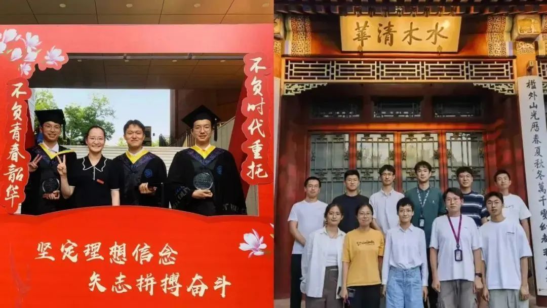 马冬晗与学生们(左);马冬昕与课题组(右)。虽然身处不同学校不同岗位,但是姐妹俩拥有共同的报国之心。