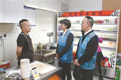 图为四川省绵阳市涪城区城厢街道清风护航服务中心清风护航员在走访商户。孙灿 摄