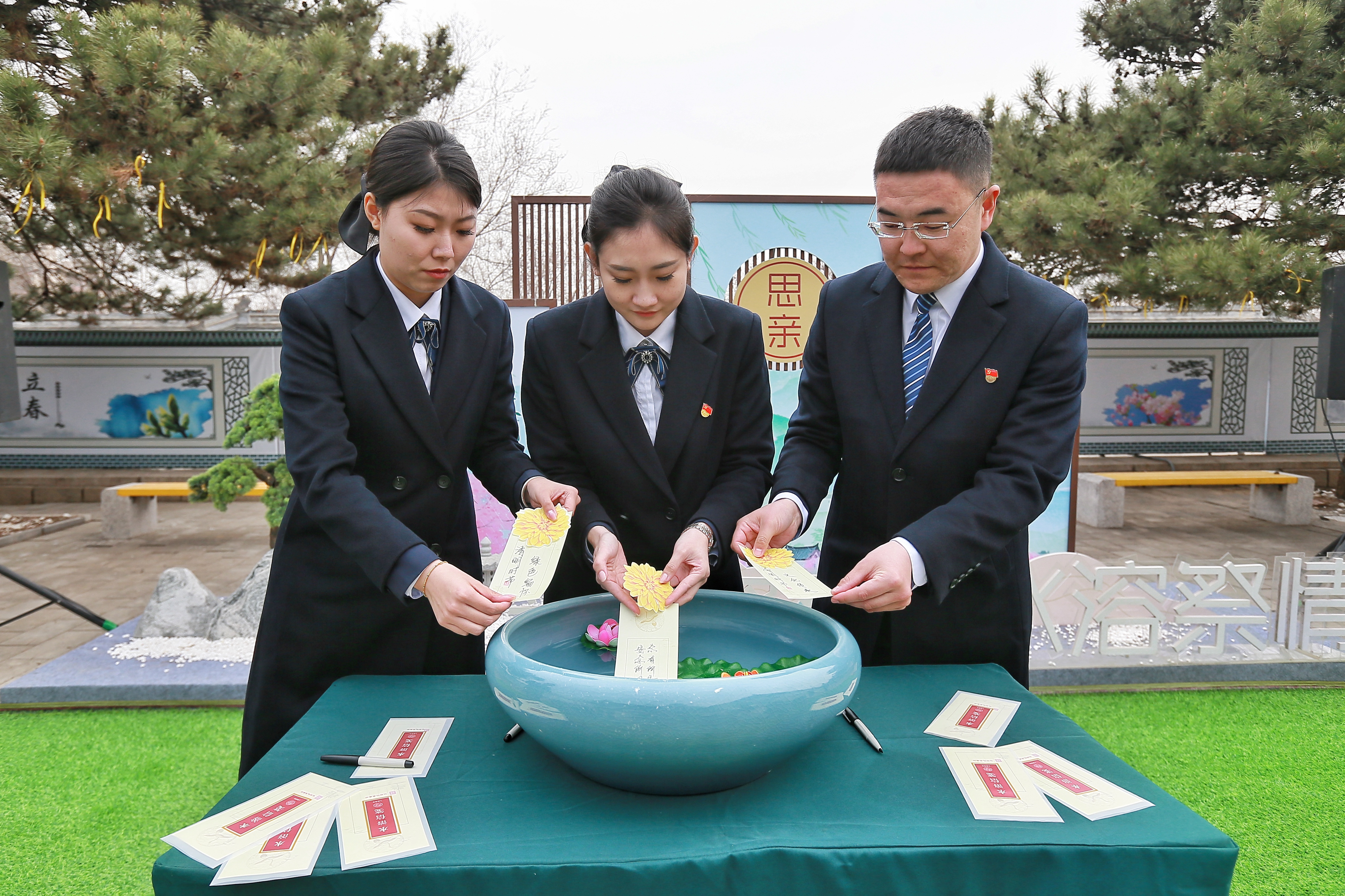 追思仪式温馨简约而又大方庄重。在舒缓的音乐中,礼仪人员为逝者敬献鲜花、诵读祭文,为苍松翠柏系上了象征思念的黄丝带。随后,礼仪人员将水溶纸折成的水溶花缓缓放入清水中,花随流水而逝,思念也随之飘向远方……