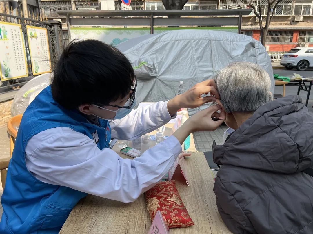 同时,中心家医团队也积极行动,为参与的养老院老人免费测血糖、测血压,发放健康宣传材料及利于老年人脑部锻炼的益智器材。其中,中医药相关内容的医疗咨询服务受到了老人们的热烈欢迎。家医们不仅围绕常见慢性病及春季好发各种传染病、过敏等用药管理进行了咨询,还针对养老院老人日常入睡困难、长期慢性疼痛等问题进行了现场中医脉诊、中医贴耳豆等治疗服务。这些服务让老人们深切感受到了多学科医防融合健康管理的优势。