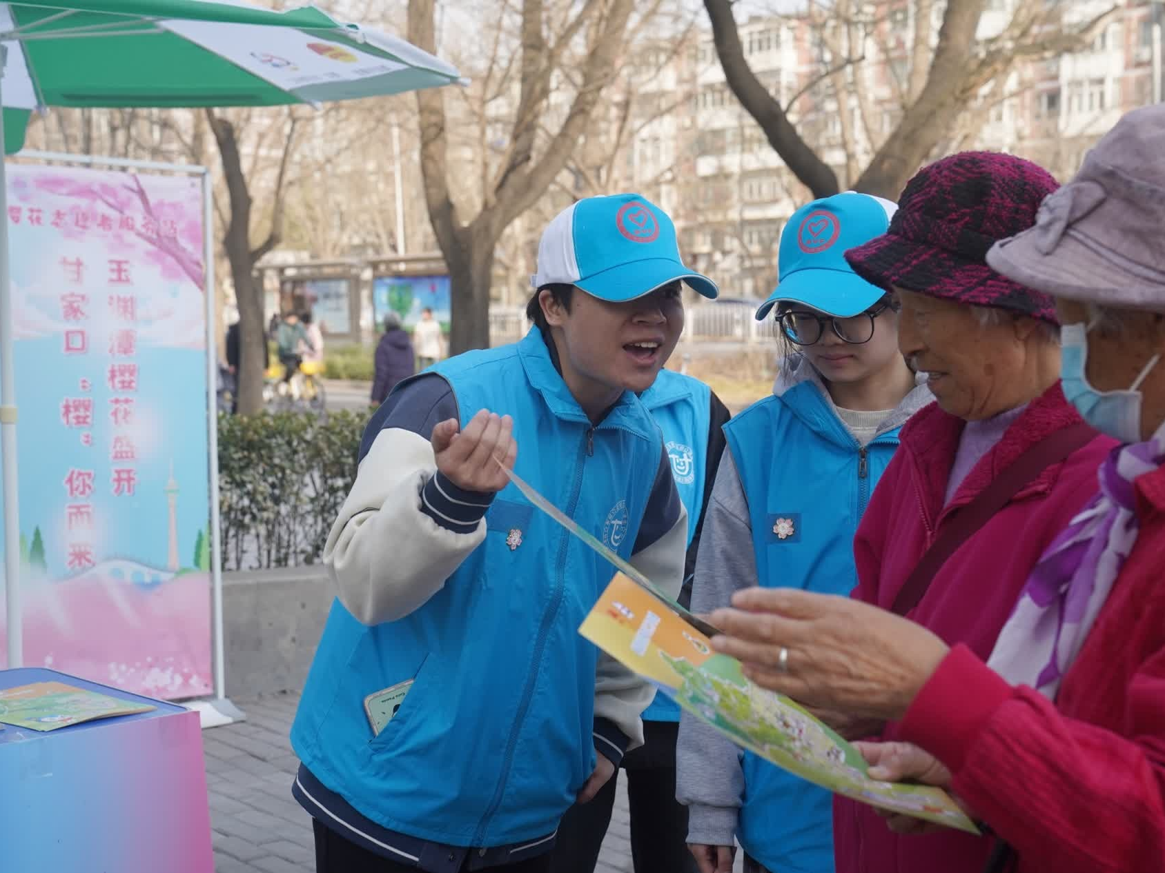 3月23日,一年一度的玉渊潭樱花节的首个周末,游客络绎不绝。攒动的人群中,身着蓝马甲的樱花志愿者们“樱”约而至,成为一道亮丽的风景线。阜成路南二街北端今年新设的樱花志愿者服务站上,来自驻区高校的大学生志愿者们正在为过往市民和游客提供服务。