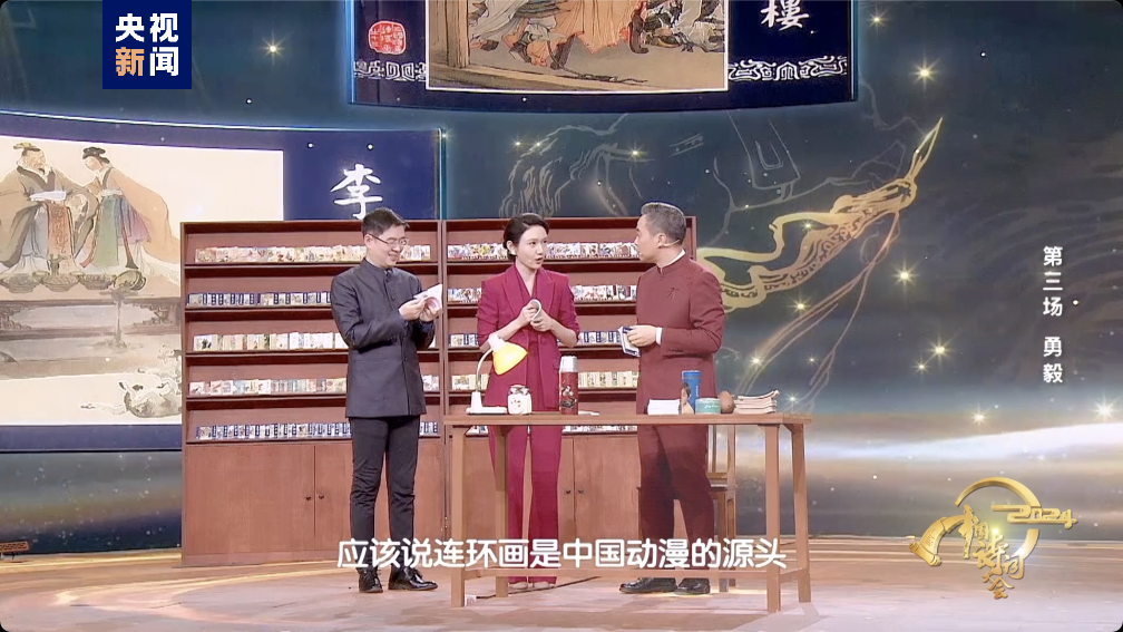在中国古代文学作品中,《三国演义》塑造了数以百计的英雄形象,他们或义或勇、或仁或智,留下了大量脍炙人口的故事。本期情景共答题环节,节目在舞台上复原了康震老师儿时的书房,带领大家重回情怀满满的“小人书”时代。康震老师和郦波老师翻动着一本本流淌着时代记忆的“三国”连环画,不禁发出感慨:《千里走单骑》《长坂坡》……在那个年代,无数孩子就是在这套连环画中成长起来的,它打开了一扇自己认识世界的窗口,也在他们那代人的童年,种下义薄云天、忠肝义胆的正能量种子。现如今随着时代的发展,互联网等新媒体的崛起让“小人书”逐渐淡出了人们的视野,但那些充满正义善良的故事,正通过继承了连环画精神的新时代“中国动漫”,继续滋养激励着每一个少年。