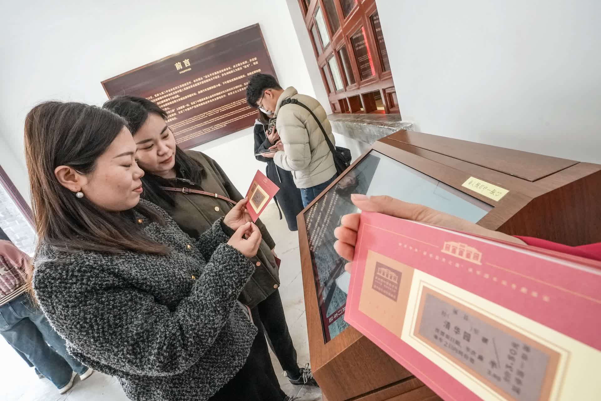 在清华园车站旧址,观众安语默走进复原的候车大厅,在售票处窗口前打印了一张写有自己名字的老车票,作为此行的专属纪念。他说:“一路追寻先辈的红色足迹,收获很多感悟。我要沿着先辈指引的方向,笃定前行,走好自己的‘赶考’路。”