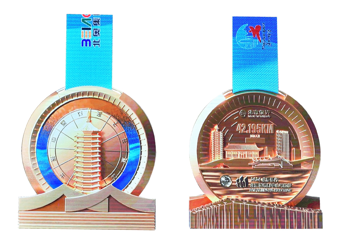 奖牌正面以古通州的标志性建筑——燃灯塔为核心元素,下为蓝色流沙圆环与可旋转的十二时辰日晷,象征时光流转千年京杭大运河奔流不息,恰似每位跑者的步履永远向前。在奖牌的背面,从左向右依次展示了燃灯塔及周边古建筑群、大光楼、副中心三大文化设施中有“运河之舟”之称的北京大运河博物馆等赛事路线途经的城市地标。奖牌底座部分的两面分别展示“文化粮仓”北京艺术中心和“森林书苑”北京城市图书馆。这些历史与现代元素交相辉映,不仅浓缩了城市副中心的蓬勃发展,更体现了时代的变迁与文化的传承。