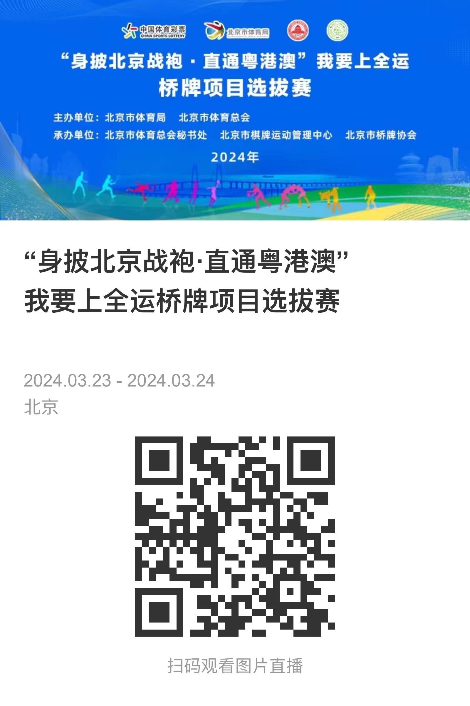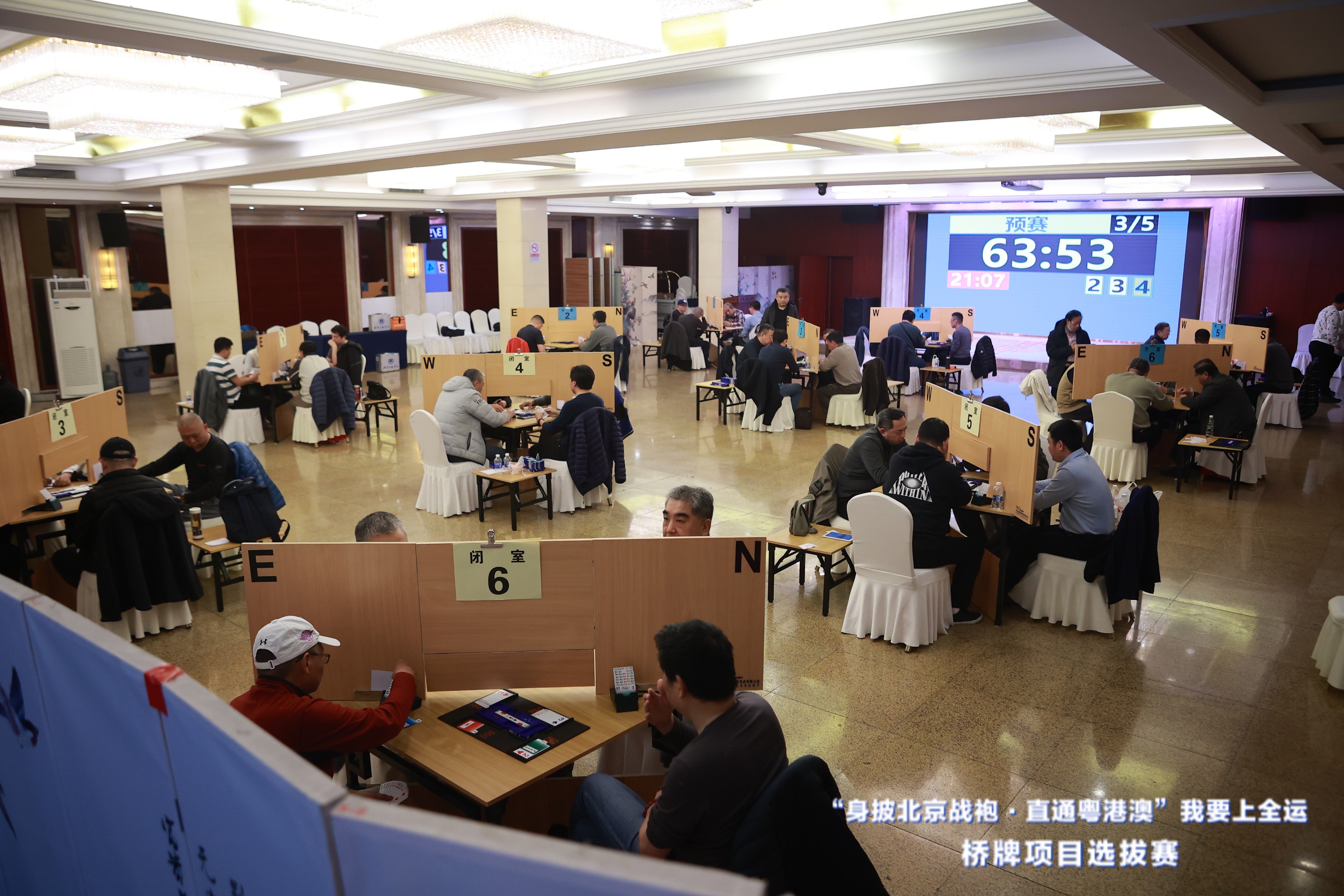由北京市体育局、北京市体育总会主办,北京市体育总会秘书处、北京市棋牌运动管理中心、北京市桥牌协会承办的“身披北京战袍·直通粤港澳-我要上全运”桥牌项目选拔赛于3月23日至24日在海淀区新兴宾馆成功举办。