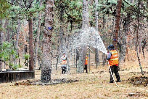 在现场,专业养护人员根据古松的不同状况,分类进行施用有机肥、输送营养液、支架保护等养护作业。古树保护高级技术员刘阳介绍:“所有古松一年都要施肥两次,施肥量多少取决于古松直径大小。直径40厘米以上的古松一年共施肥8至10千克,直径40厘米以下的一年共施肥5至8千克。精准施肥可以满足古松生长所必需的各种养分,提高抗病抗逆能力。”