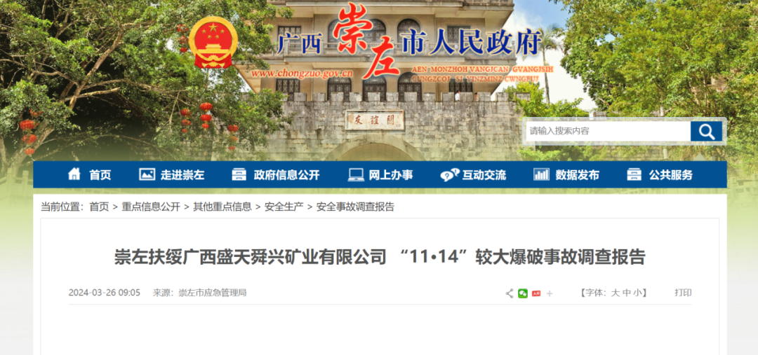 日前,广西壮族自治区崇左市人民政府公布了《崇左扶绥广西盛天舜兴矿业有限公司“11·14”较大爆破事故调查报告》披露了这起事故。