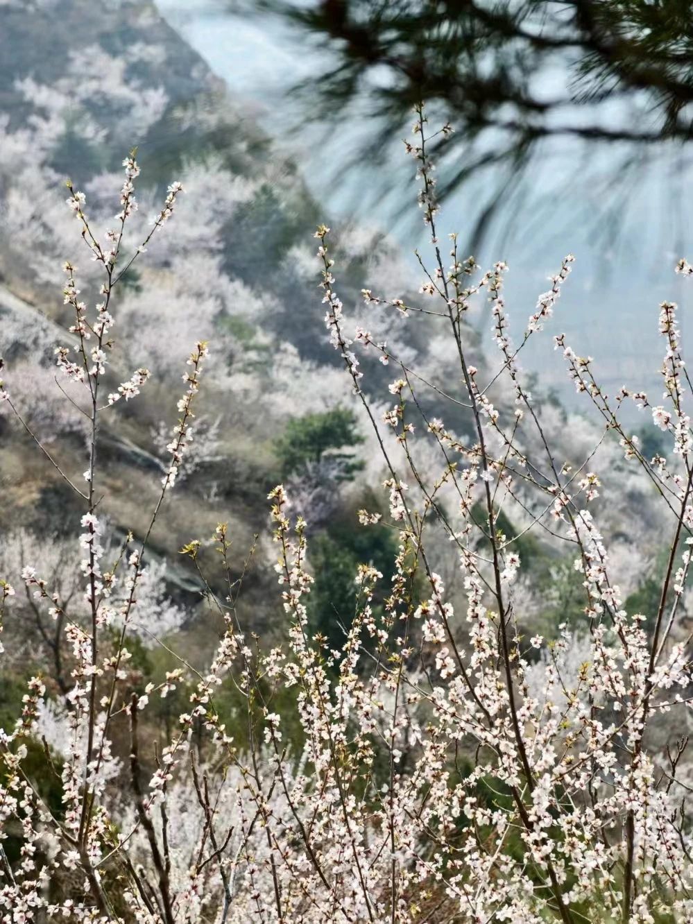 每年3月下旬至4月下旬,路边万亩山杏花、山桃花、梨花竞相绽放,远望好似一片粉白色的花海。