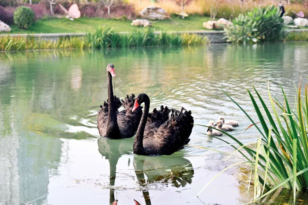 黑天鹅一家在亮马河上游玩。图/北京市朝阳区融媒体中心