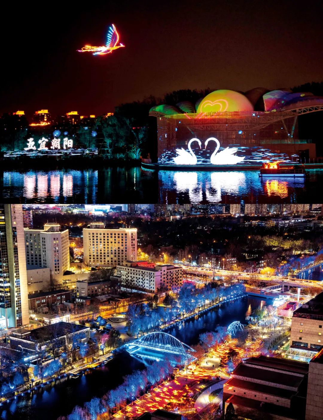 2023年冬季,以光影为媒、以艺术为境的北京朝阳国际灯光节通过五光十色的光影场景和系列文商旅活动,打造了北京夜间文娱消费的新场景,进一步激发了城市消费活力。尤其蓝港商圈分会场,因为河流景观的加持,成为灯光节最具标志性特色的区域承载地,其中最出圈的要数蓝港码头上演的“吉凤朝阳”,数只丹凤飞舞在亮马河上空的视频几乎刷爆了当时的社交媒体。